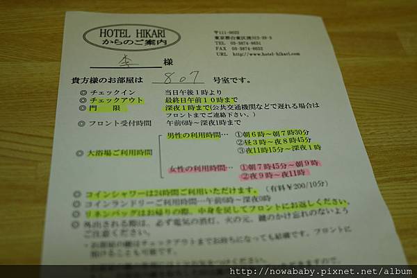 房間相關資訊~1.check in 13:00~ 2.check out 10:00~ 3.門禁是深夜1點 4.女性大浴場時間是早上4:45-9:00,和晚上9點到11點~~